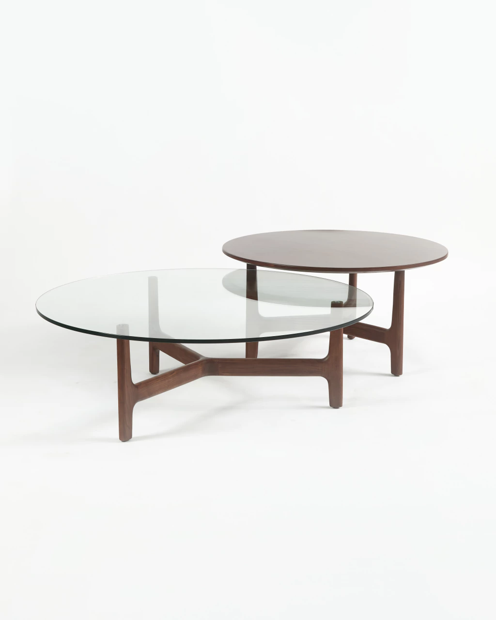 Juego de 2 mesas – vienen juntas.Material: Madera fresno y vidrio.Medidas: Mesa Vidrio - 110 cm. diámetro, 37 cm. alto. Mesa Madera - 85,5 cm. diámetro, 44 cm. alto.