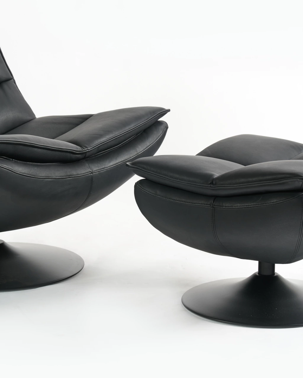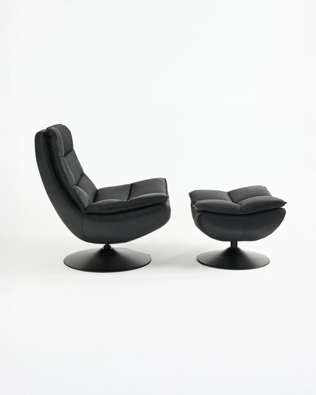 Sillón individual giratorio, con posapies. Material: 100% Cuero. Estructura de madera. Base de metal. Medidas: Sillón - 86 cm. x 89 cm. x 94.5 cm. Posapies - 66 cm. x 57 cm. x 46 cm.